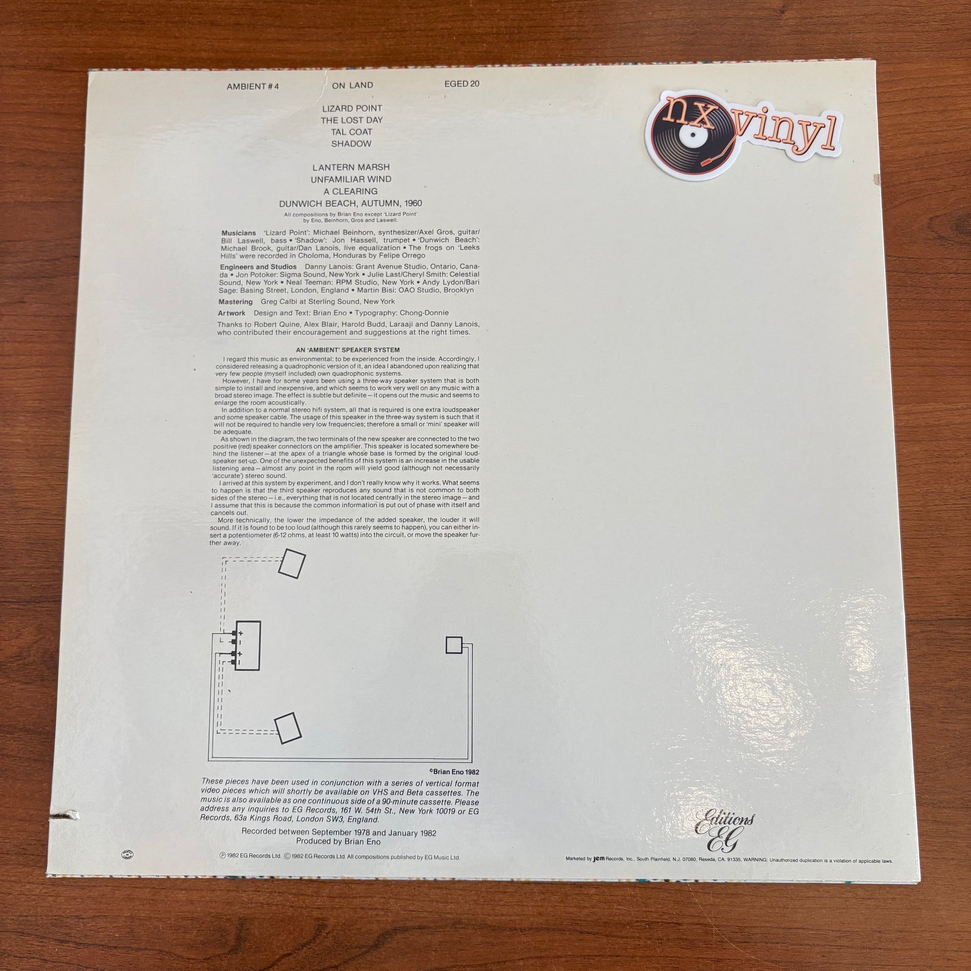 Brian Eno's fourth ambient album, *On Land*, explores the intersection of environmental sound and electronic composition. Released in 1982, this landmark work moves beyond studio abstraction to capture the textures of natural and urban landscapes—from coastal atmospheres to industrial spaces. Eno's layered synthesizers and field recordings create immersive soundscapes designed for deep listening or unobtrusive background accompaniment. Essential for collectors of ambient music and those seeking sophisticated instrumental exploration.